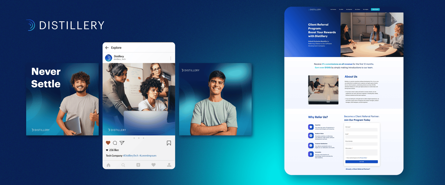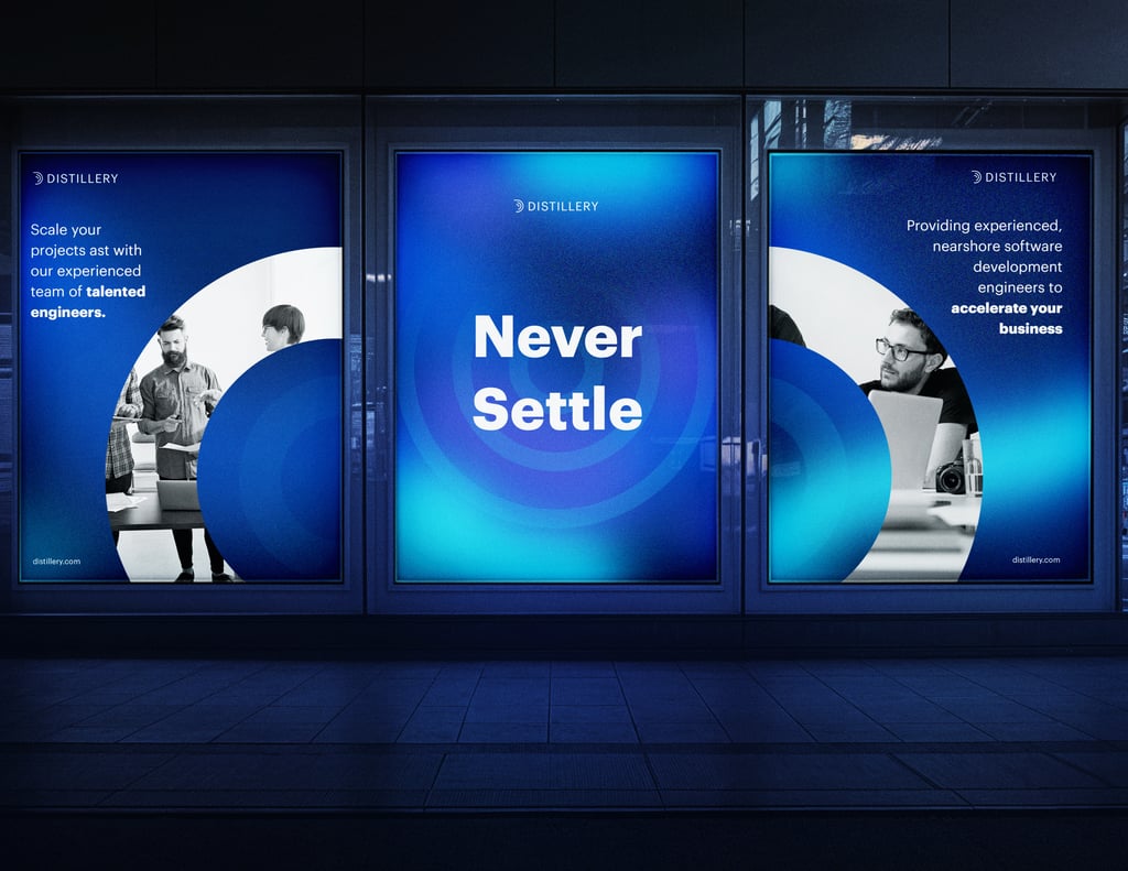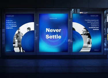 Distillery needed a brand and digital presence that matched its evolution into a global technology partner. I led a full visual transformation as the sole designer, redesigning the brand system, digital experience, and marketing visual foundation. The result is a cohesive, scalable identity anchored in the brand’s new global message: Never Settle.